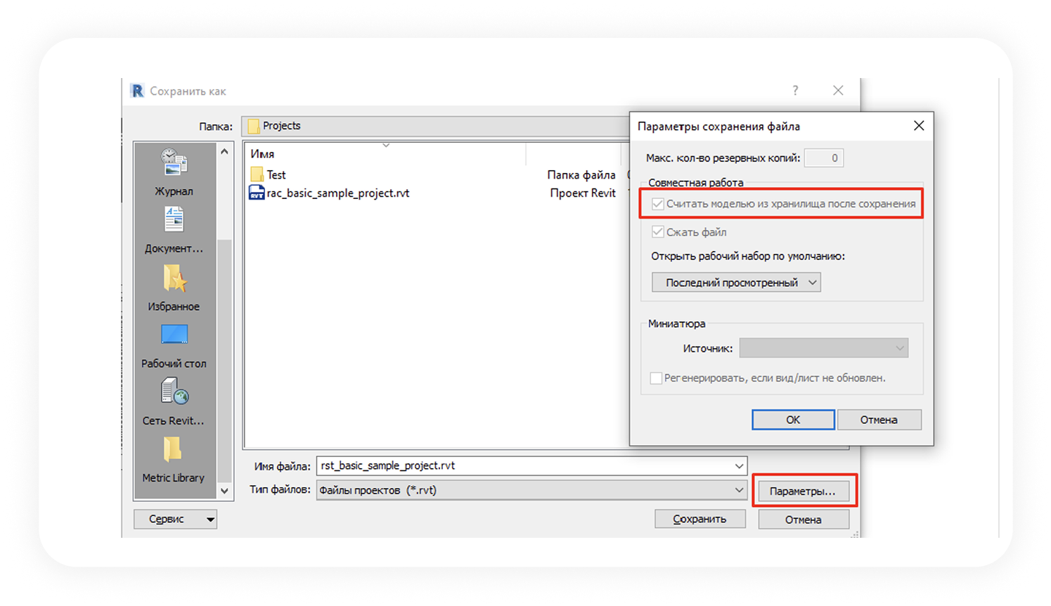 Заходим в Параметры и проверяем, что появилась галочка напротив пункта «Считать моделью из хранилища»