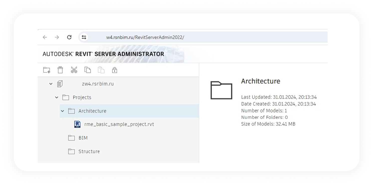 Вы попадете в Административную панель Revit Server. Она предоставляет различные функции для управления и мониторинга Revit Server.