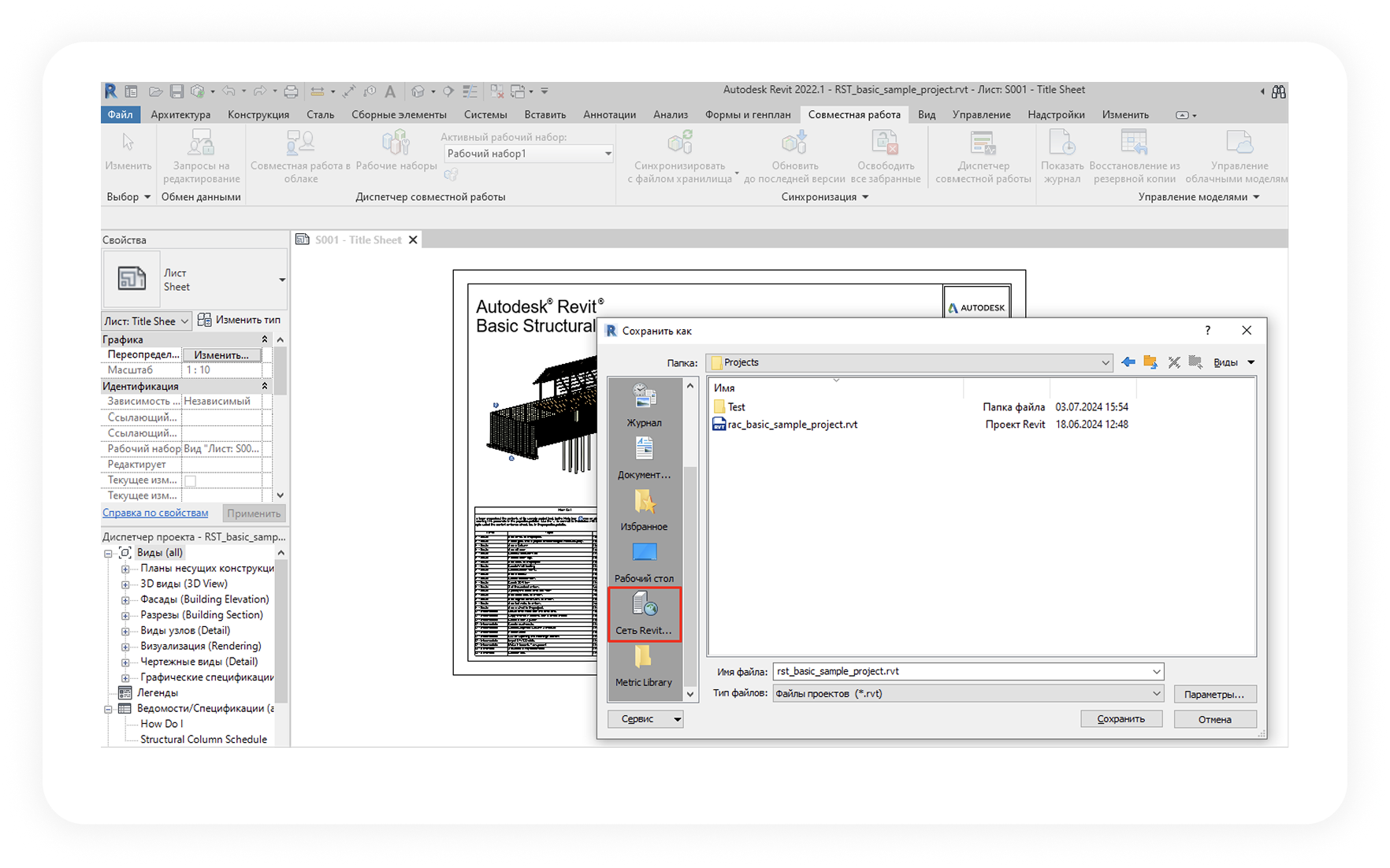 Файл – Сохранить как и сохраняем проект на Revit Server